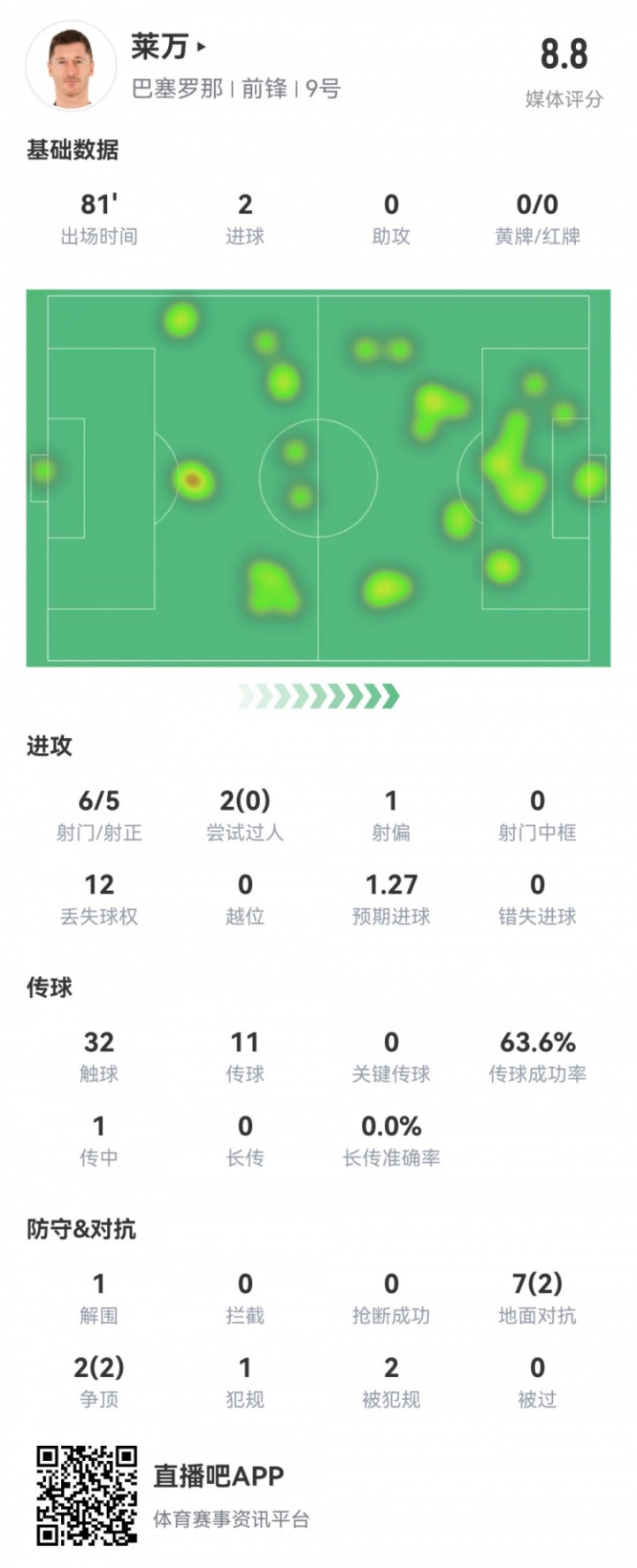 直播吧4月10日讯欧冠1/4决赛首回合,巴萨4-0领先多特。莱万双响建功第81分钟被换下,球员全场重点数据如下↓6射5正2粒进球12次丢失球权预期进球1.2732次触球传球成功率63.6%9次对抗成功4次评分全场最高8.8